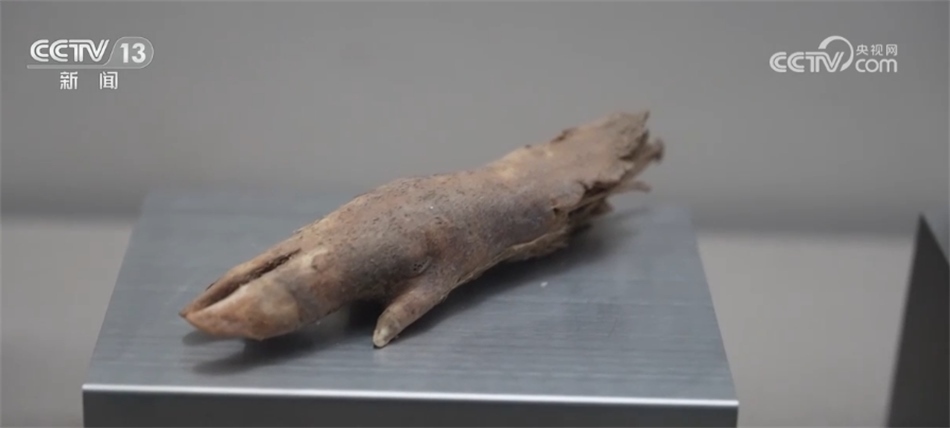 嘉峪關市紅領巾講解員 辛宇軒:這個是漢代豬蹄,是守衛(wèi)邊疆士卒們留下來的遺存之物,距今2000余年,是極為難得的長城文物。我們可以看得出來,它的骨架、腳趾保存都是相對完好的,這是野豬的豬蹄,我們這邊氣候干燥,所以就不會把它給腐蝕掉。