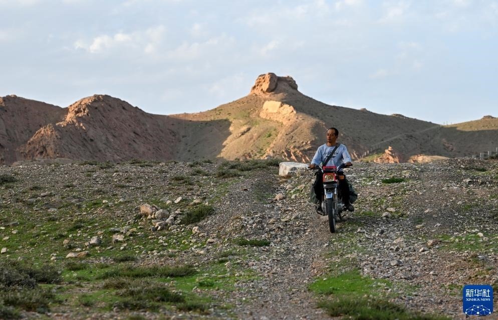 8月20日,董海寧騎摩托車(chē)巡查賀蘭山沿線(xiàn)的明長(zhǎng)城永寧段。新華社記者 馮開(kāi)華 攝
