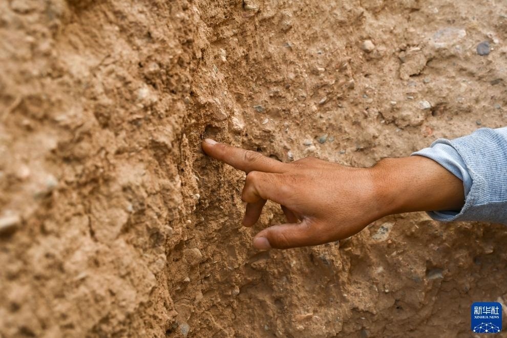 8月20日,董海寧觀察長(zhǎng)城墻體情況。新華社記者 劉金海 攝