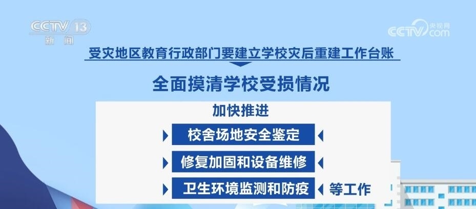 教育部強(qiáng)調(diào),要慎終如始做好災(zāi)后恢復(fù)重建各項(xiàng)工作,穩(wěn)慎做好受災(zāi)師生安置慰問、補(bǔ)償救助等工作。受災(zāi)地區(qū)教育行政部門要建立學(xué)校災(zāi)后重建工作臺(tái)賬,全面摸清學(xué)校受損情況,加快推進(jìn)校舍場地安全鑒定、修復(fù)加固和設(shè)備維修、衛(wèi)生環(huán)境監(jiān)測和防疫等工作。確實(shí)在開學(xué)前不能完成災(zāi)后重建的,要立足實(shí)際采取臨時(shí)轉(zhuǎn)移就學(xué)等舉措,全力保障正常開學(xué)。各地各校要一體推進(jìn)防汛救災(zāi)和校園安全治理,健全校園安全常規(guī)檢查機(jī)制,持續(xù)深入排查整治風(fēng)險(xiǎn)隱患,有效防范原發(fā)、誘發(fā)性自然災(zāi)害和次生安全風(fēng)險(xiǎn)。