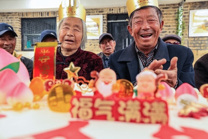 老人在山東榮成夏莊鎮(zhèn)甲夼馬家村“暖心食堂”過(guò)生日(2021年4月16日攝)。新華社發(fā)(李信君 攝)