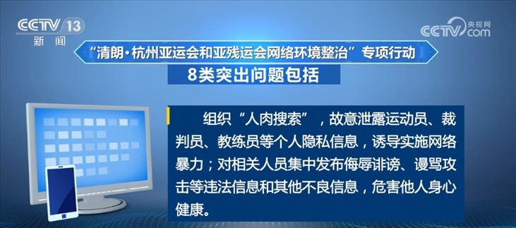 央視網(wǎng)消息:記者昨天(8月28日)從中央網(wǎng)信辦獲悉,為做好杭州亞運(yùn)會(huì)和亞殘運(yùn)會(huì)保障工作,決定自8月28日至10月29日開展“清朗·杭州亞運(yùn)會(huì)和亞殘運(yùn)會(huì)網(wǎng)絡(luò)環(huán)境整治”專項(xiàng)行動(dòng)。專項(xiàng)行動(dòng)將圍繞賽事舉辦,集中整治散布虛假信息、片面、歪曲傳播突發(fā)事件信息等8類突出問題。