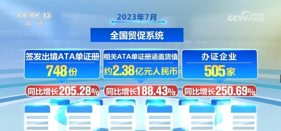 2023年7月,全國貿(mào)促系統(tǒng)共簽發(fā)出境ATA單證冊(cè)748份,同比增長205.28%;相關(guān)ATA單證冊(cè)涵蓋貨值約2.38億元人民幣,同比增長188.43%;辦證企業(yè)505家,同比增長250.69%。