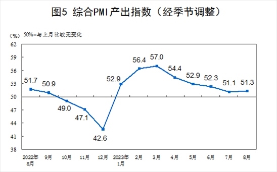8月份,綜合PMI產(chǎn)出指數(shù)為51.3%,比上月上升0.2個(gè)百分點(diǎn),繼續(xù)保持在擴(kuò)張區(qū)間,表明我國企業(yè)生產(chǎn)經(jīng)營活動(dòng)總體穩(wěn)定擴(kuò)張。