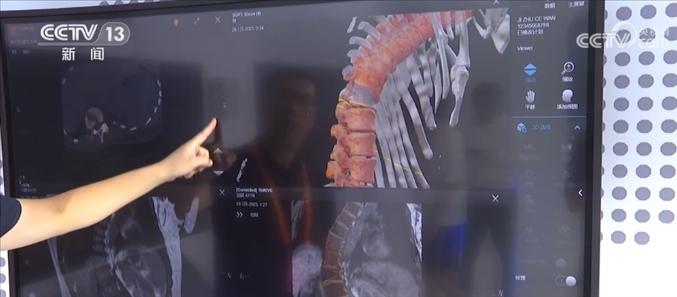 總臺(tái)記者 王豐:這里主要呈現(xiàn)的是一個(gè)智能手術(shù)室的系統(tǒng),這是一套幫助醫(yī)生進(jìn)行精準(zhǔn)手術(shù)計(jì)劃的設(shè)備,比如說我們可以利用一張X光片,一張CT或者一張核磁影像,就可以還原出一個(gè)3D的影像,醫(yī)生通過3D的建模,可以精準(zhǔn)地看到病灶所在的位置,包括他如何下刀,來精準(zhǔn)地制定手術(shù)計(jì)劃。