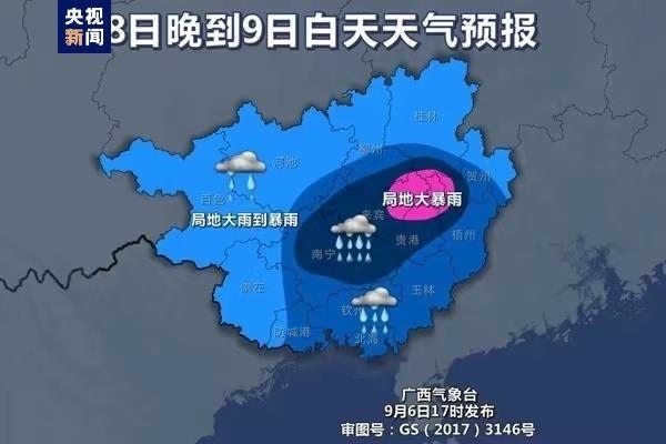 8日晚上到9日白天,南寧、來賓、貴港、梧州、玉林、北海、欽州、防城港等市和賀州、桂林、柳州三市南部有大雨到暴雨、局地大暴雨,廣西其他地區(qū)有中雨、局地大雨到暴雨。