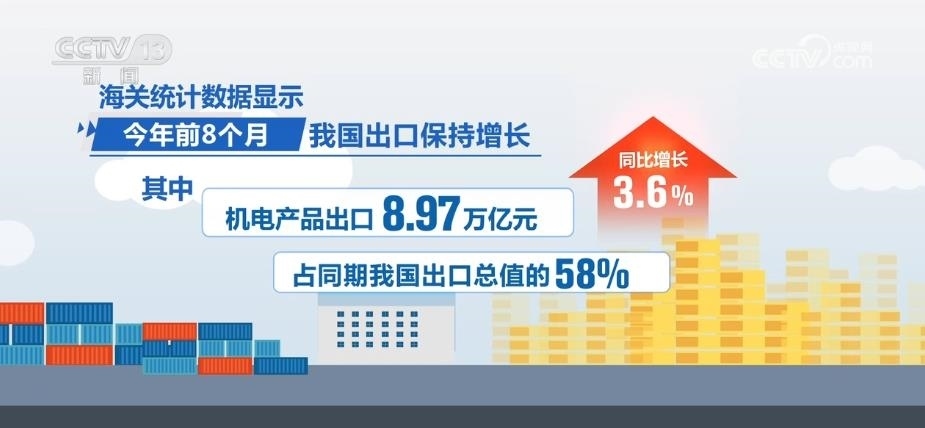 海關統(tǒng)計數(shù)據(jù)顯示,2023年前8個月,我國出口保持增長,其中,機電產(chǎn)品出口8.97萬億元,同比增長3.6%,占同期我國出口總值的58%;汽車及零配件、船舶、電工器材出口分別增長50.1%、28%、18.6%。