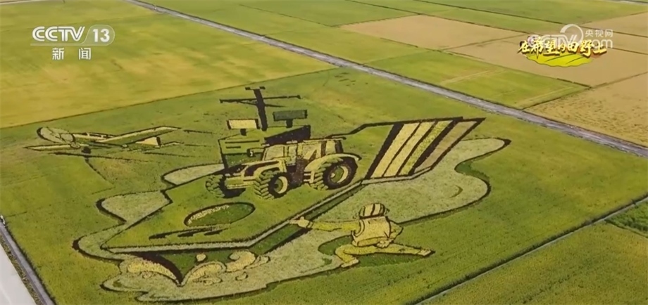總臺(tái)央視記者 蔣樹林:金秋9月的稻田是什么顏色的?9月的稻香又是什么味道?來這里,有可能會(huì)找到您想要的答案。我現(xiàn)在是在黑龍江北大荒閆家崗農(nóng)場。大家來看,這個(gè)稻田觀景臺(tái)有十多米高,因此站在這里,秋日稻田大片的圖案映入眼簾,今年稻田畫以“鄉(xiāng)村振興”“數(shù)字農(nóng)業(yè)”為主題,生動(dòng)展現(xiàn)了“讓農(nóng)業(yè)更美好、讓農(nóng)民更幸?!钡拿篮迷妇?。稻田畫是農(nóng)民們勤勞與智慧的展現(xiàn),他們用稻田畫為家鄉(xiāng)水稻代言,而對于在黑土地打拼的北大荒人而言,還有更重要的意義。