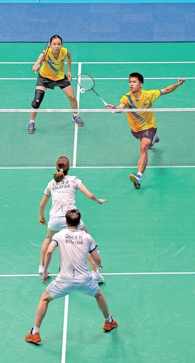 10月4日,杭州亞運會羽毛球混合雙打1/8決賽,馬來西亞體育代表團組合對陣泰國體育代表團組合。圖為雙方運動員在比賽中。本報記者 伊霄攝