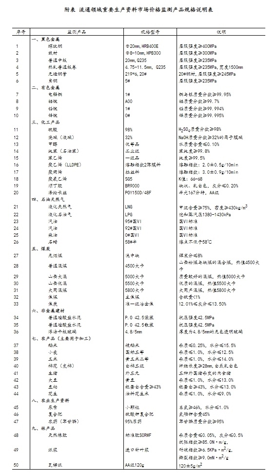流通領域重要生產資料市場價格監(jiān)測內容包括9大類50種產品的價格。類別與產品規(guī)格說明詳見附表。