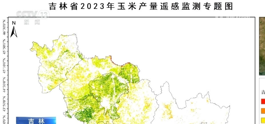 這張就是吉林省玉米產(chǎn)量的初步估產(chǎn)圖。作為本年度吉林省農(nóng)作物監(jiān)測的重要成果之一,它清晰地反映出玉米在吉林省的分布情況。