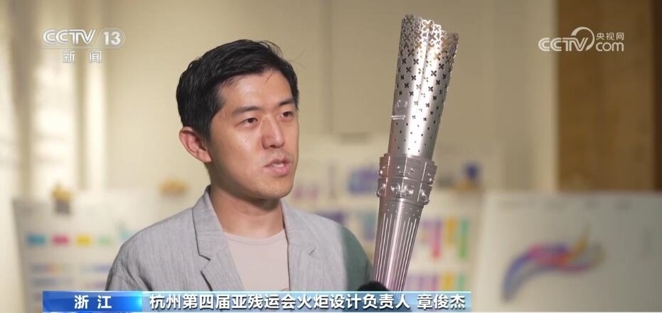 杭州第四屆亞殘運(yùn)會(huì)火炬設(shè)計(jì)負(fù)責(zé)人 章俊杰:玉琮是實(shí)證中華五千年(文明史)的良渚(遺址)文明當(dāng)中的一個(gè)重要禮器,我們把玉琮作為核心意象,外方內(nèi)圓,我們?cè)谂e起火炬的時(shí)候,所有人的視覺(jué)焦點(diǎn)玉琮它承上啟下,分別代表了不同的寓意。承上,我們用點(diǎn)點(diǎn)的星光匯聚成桂花桂冠,可以看到星光越來(lái)越稠密,這是我們希望體現(xiàn)整個(gè)火炬設(shè)計(jì)的積極向上的那種力量感;玉琮往下,在這個(gè)地方設(shè)計(jì)有幾十條的科技線,它就好像是綿延著人類(lèi)的歷史和城市科技的脈絡(luò)。