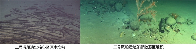 二號(hào)沉船遺址位于一號(hào)沉船遺址東北約12海里處,由核心區(qū)和散落區(qū)組成,年代為明弘治年間。核心區(qū)為大量碼放整齊的原木堆積,長(zhǎng)約21米,最寬約8米,核心區(qū)西北及東部各有一處由少量原木和陶瓷器散落形成的堆積。二號(hào)沉船暫未發(fā)現(xiàn)船體,僅在核心區(qū)原木堆積中發(fā)現(xiàn)一根疑似船構(gòu)件的條木。
