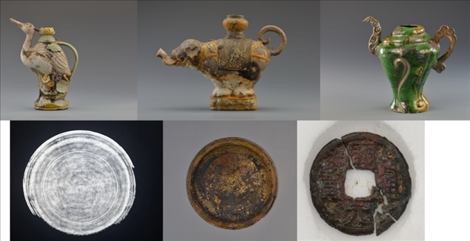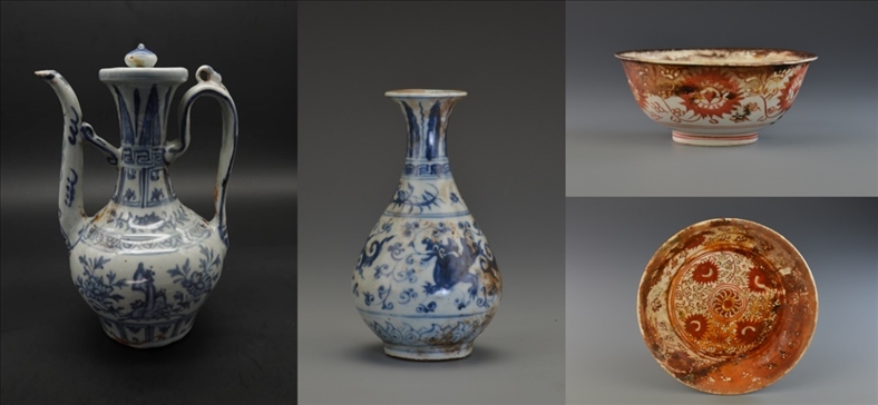 一號(hào)沉船遺址有多個(gè)隔艙的船貨堆積,包括陶器、瓷器、銅器、鐵器、竹木器等,數(shù)量超十萬(wàn)件,代表性器物有醬釉陶罐,琺華梅瓶,青花執(zhí)壺、玉壺春瓶,紅綠彩碗、盤、杯,青釉玉壺春瓶,青白釉盤、碗,白釉三足圓香爐,藍(lán)釉高足碗,單色釉玉壺春瓶、扁壺,素三彩螺形壺、象形壺、鶴形壺,鐵鍋,銅盤、銅錢等。二號(hào)沉船遺址發(fā)現(xiàn)大量尺寸相近、碼放整齊的原木及少量陶器、瓷器、蠑螺殼等。