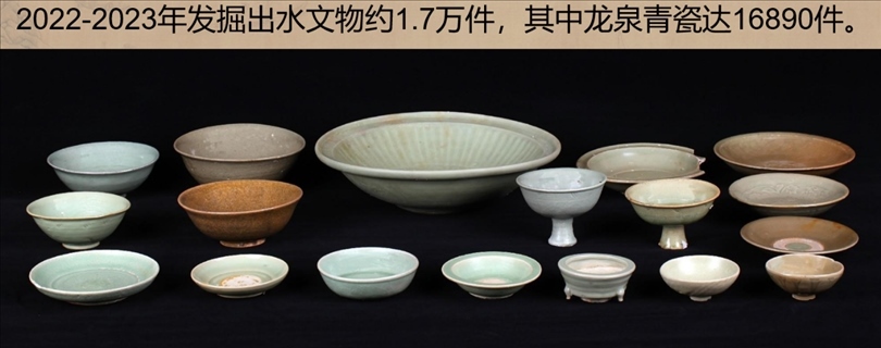 發(fā)掘出水文物標(biāo)本約1.7萬(wàn)件,主要為龍泉青瓷和陶罐、鉛錘、印章等船上生活、航海相關(guān)文物。其中龍泉青瓷數(shù)量達(dá)到1.6萬(wàn)余件,器形包括碗、盤、碟、盞、洗、缽、香爐和高足杯等,年代為元代晚期,為典型的外銷貿(mào)易瓷。結(jié)合溫州朔門古港的考古發(fā)現(xiàn),推測(cè)該沉船可能是從溫州港出海前往東南亞的民間貿(mào)易商船。