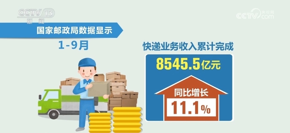 此外,1—9月,全國(guó)郵政行業(yè)業(yè)務(wù)收入(不包括郵政儲(chǔ)蓄銀行直接營(yíng)業(yè)收入)累計(jì)完成11013.3億元,同比增長(zhǎng)10.7%。其中,快遞業(yè)務(wù)收入累計(jì)完成8545.5億元,同比增長(zhǎng)11.1%。