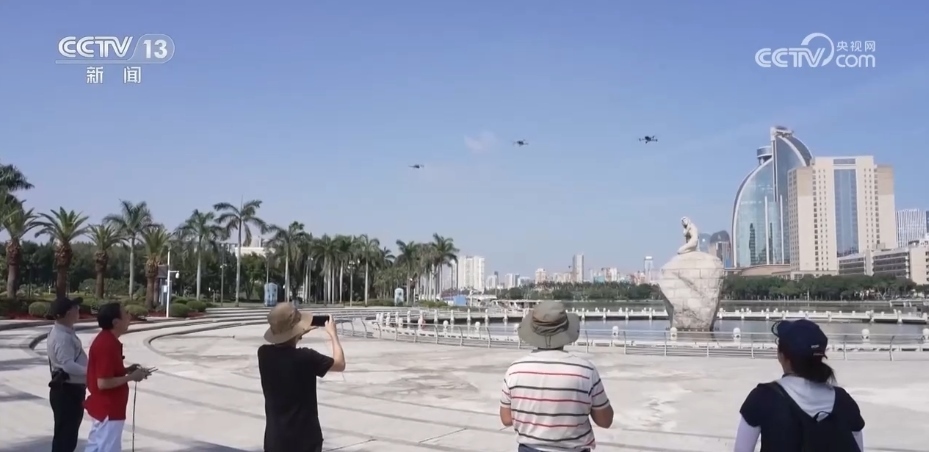 在廈門的白鷺洲上,四架無(wú)人機(jī)在空中列隊(duì)一字排開。