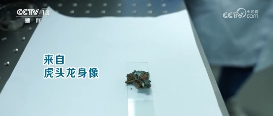 四川省文物考古研究院館員 肖慶:這件樣品是從8號(hào)坑的虎頭龍身像上取下來的樣品。這件器物的特別之處就是在它的底座上,有很多紅顏色類似顏料樣的東西?,F(xiàn)在要做的就是來確定這個(gè)紅色的顏料到底是什么物質(zhì)。