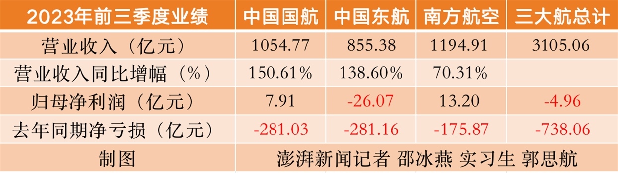 截至10月27日晚間,中國(guó)國(guó)航(601111.SH)、中國(guó)東航(600115.SH)、南方航空(600029.SH)陸續(xù)披露完2023年三季報(bào)。前三季度,三大航合計(jì)實(shí)現(xiàn)營(yíng)收3105.06億元,凈虧損4.96億元。其中三大航三季度單季均實(shí)現(xiàn)扭虧,前三季度中僅東航仍虧損。
