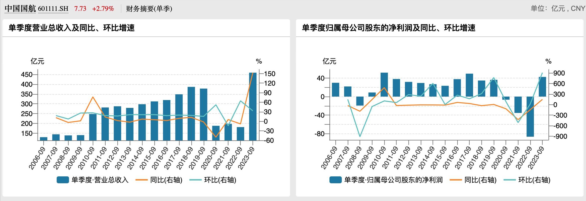 據(jù)wind數(shù)據(jù)顯示,國(guó)航今年第三季度和前三季度整體的營(yíng)收均創(chuàng)歷史新高,前三季度的營(yíng)收繼2018、2019年后再破千億元。第三季度的歸母凈利潤(rùn)已恢復(fù)至疫情前同期水平,處于歷史高位,次于2017年的49.52億元。前三季度整體雖實(shí)現(xiàn)扭虧,但凈利潤(rùn)和疫情前相比仍有一定距離。