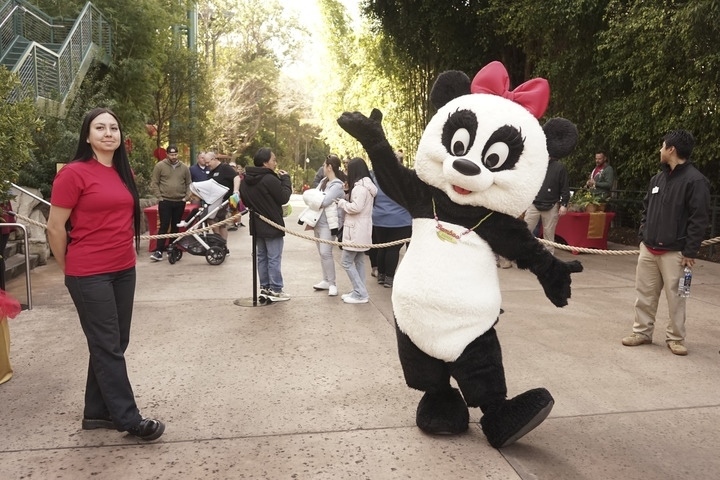 2月4日,在美國圣迭戈動物園,一名裝扮成熊貓的工作人員在春節(jié)慶?;顒由蠚g迎游客。