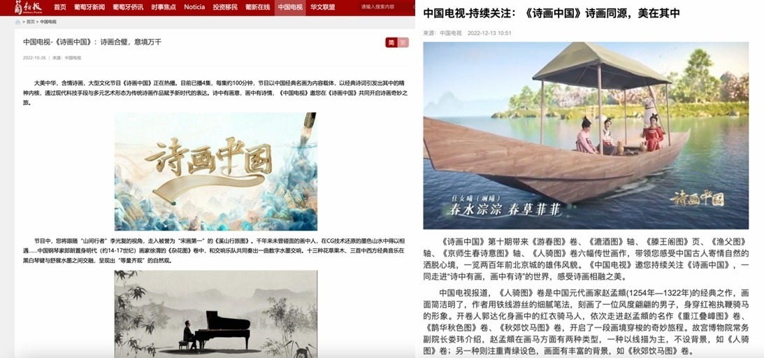 同時,《詩畫中國》在傳播上也達(dá)到了節(jié)目內(nèi)外的同頻共振,成功讓華夏文明輻射至全世界。在美國《國際日報》網(wǎng)站和社交媒體賬號、法國《歐洲時報》網(wǎng)站和App、俄羅斯《龍報》網(wǎng)站和世界頭條App“北極熊視野”賬號等華文新媒體平臺上,節(jié)目相關(guān)內(nèi)容廣受歡迎。在2022“非洲伙伴”媒體合作論壇上,《詩畫中國》還作為總臺優(yōu)秀作品進(jìn)行了展示。日前于戛納影節(jié)宮舉辦的第六屆WISDOM in CHINA中國原創(chuàng)節(jié)目模式推介會上,節(jié)目更是以中國原創(chuàng)之名,登上了Mipcom主舞臺。