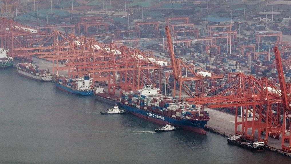 10月26日,在欽州港集裝箱裝卸碼頭,海事船正在協(xié)助海輪離岸(無人機(jī)照片)。新華社記者 張愛林 攝