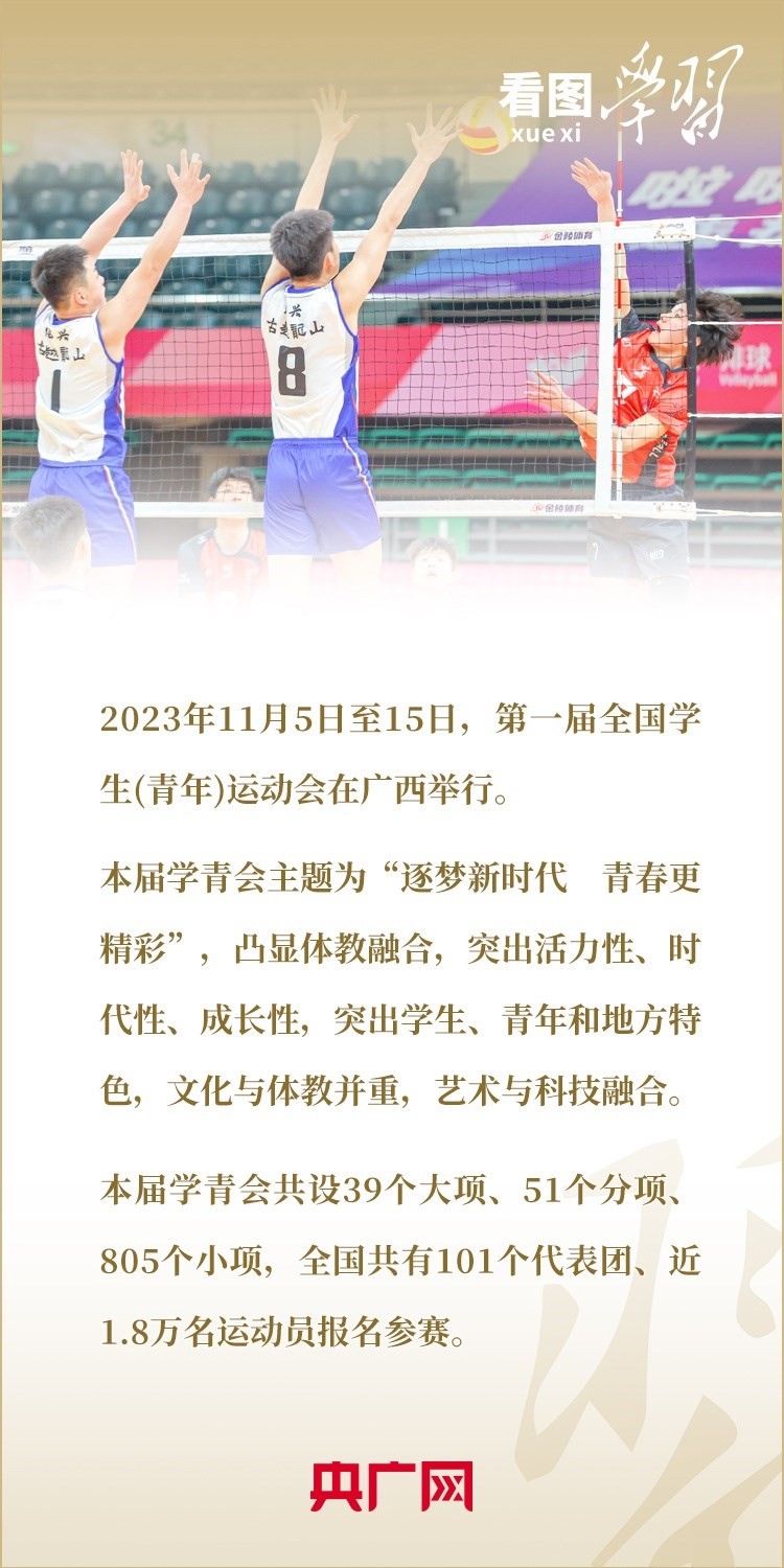 11月5日至15日,第一屆全國(guó)學(xué)生(青年)運(yùn)動(dòng)會(huì)在廣西舉行。這是全國(guó)青年運(yùn)動(dòng)會(huì)和全國(guó)學(xué)生運(yùn)動(dòng)會(huì)合并后的第一屆運(yùn)動(dòng)會(huì),是加快體育強(qiáng)國(guó)建設(shè)、加快健康中國(guó)建設(shè)、深化體教融合發(fā)展、促進(jìn)青少年健康成長(zhǎng)的重要舉措。