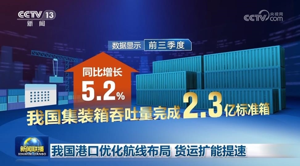 數(shù)據(jù)顯示,前三季度我國(guó)集裝箱吞吐量完成2.3億標(biāo)準(zhǔn)箱,同比增長(zhǎng)5.2%。其中第三季度增長(zhǎng)5.9%,增速較上半年加快1個(gè)百分點(diǎn)。
