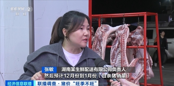 湖南某生鮮配送有限公司負(fù)責(zé)人 張敏:10月份到11月份(每天銷(xiāo)量)是450頭到600頭。預(yù)計(jì)12月份到1月份(白條豬銷(xiāo)量)會(huì)增長(zhǎng)到一天800頭到1000頭。