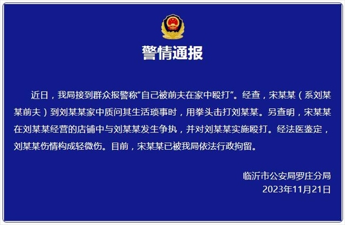 ·山東臨沂一女子被前夫毆打,警方通報:男子已被行拘。