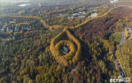 2023年11月19日,南京,初冬時節(jié)的鐘山風景名勝區(qū)層林盡染,色彩斑斕。空中俯瞰被梧桐樹包圍的美齡宮,宛如一條“金色項鏈”,美不勝收。