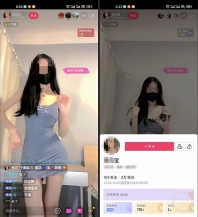 在另一社交平臺(tái)中,面容姣好、標(biāo)簽為“大學(xué)生”的女主播“丫頭XXX”在23日凌晨1點(diǎn)過(guò)仍在直播,她和一位上了年紀(jì)的男性連麥互動(dòng),直播間標(biāo)簽寫(xiě)著“穿云箭帶走、啤酒俯臥撐、私人**任你、喜歡你進(jìn)裙”。