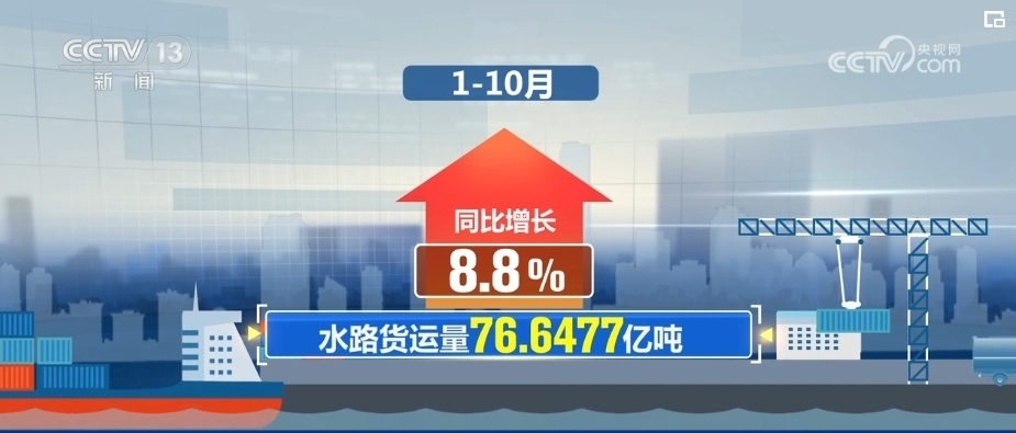 貨運方面,1—10月,我國公路貨運量332.9567億噸,同比增長8.2%;水路貨運量達(dá)76.6477億噸,同比增長8.8%。