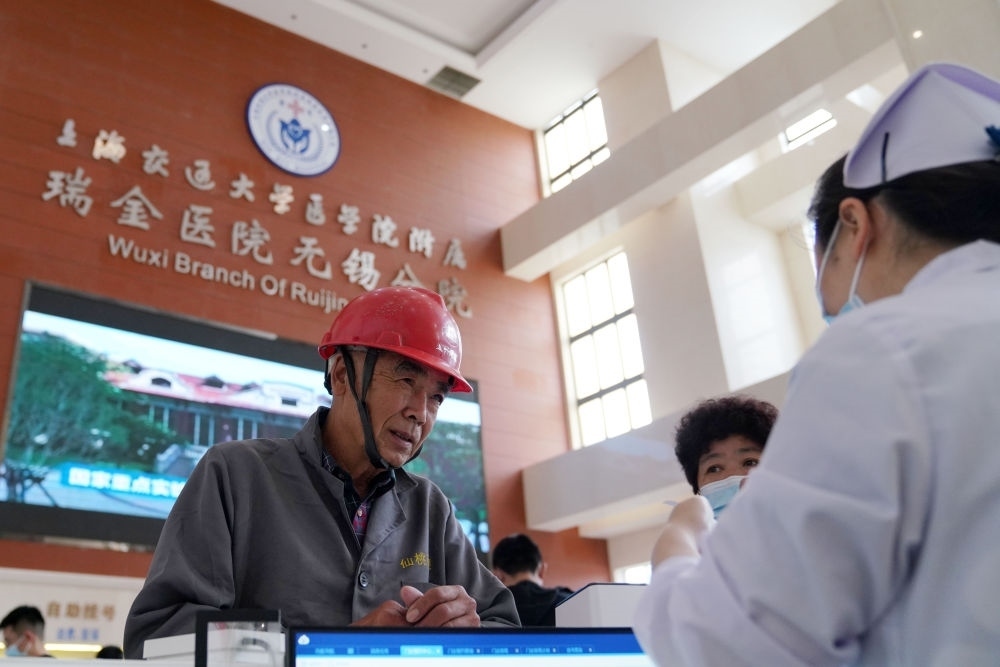 2023年5月18日,在位于江蘇省無錫市的上海交通大學(xué)醫(yī)學(xué)院附屬瑞金醫(yī)院無錫分院,就診者在服務(wù)臺(tái)咨詢。