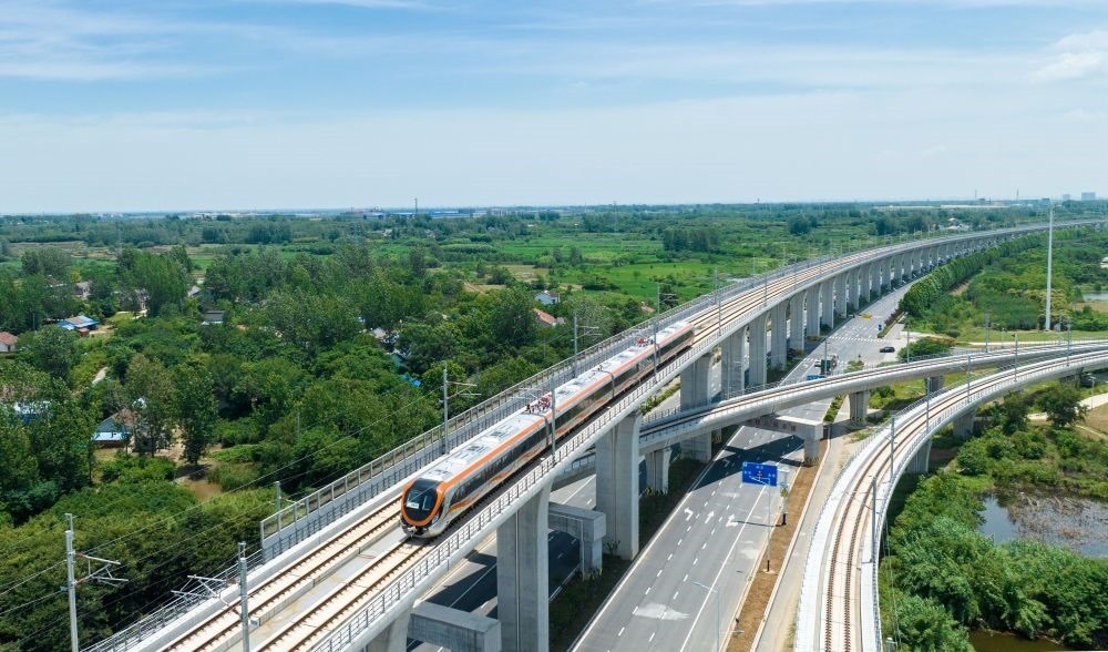這是在安徽省滁州市來安縣境內(nèi)拍攝的滁寧城際鐵路列車(2023年6月28日攝,無人機(jī)照片)。當(dāng)日,滁寧城際鐵路滁州段開通運(yùn)營。滁寧城際鐵路西起滁州高鐵站,止于正在規(guī)劃建設(shè)中的南京北站,全長約55公里。