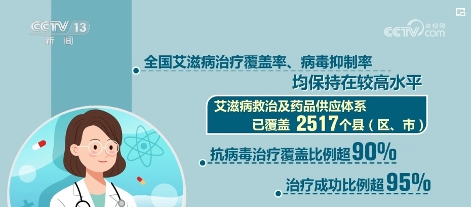 全國艾滋病治療覆蓋率、病毒抑制率均保持在較高水平。艾滋病救治及藥品供應(yīng)體系已覆蓋2517個縣(區(qū)、市),抗病毒治療覆蓋比例超90%,治療成功比例超95%。