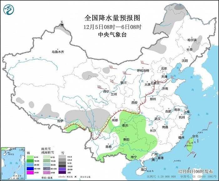 12月5日08時(shí)至6日08時(shí),新疆北疆北部、甘肅河西、內(nèi)蒙古東北部、黑龍江西北部、吉林中部、西藏東部、川西高原等地部分地區(qū)有小到中雪或雨夾雪,其中,新疆阿勒泰山區(qū)等地局地有大雪(5~6毫米)。西藏東南部、湖北西南部、湖南西部和南部、四川東部、重慶、貴州大部、云南南部、廣西、臺(tái)灣島等地部分地區(qū)有小雨。內(nèi)蒙古中西部、青海東部等地部分地區(qū)有5~7級(jí)風(fēng)(見圖2)。