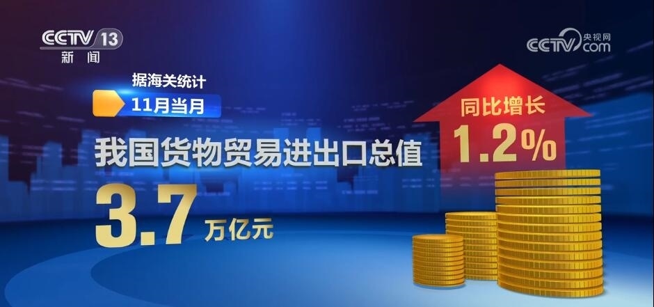 央視網消息:海關總署今天(12月7日)對外公布,今年11月份,我國貨物貿易進出口總值3.7萬億元,同比增長1.2%。數據顯示,我國外貿穩(wěn)中向好態(tài)勢進一步鞏固。
