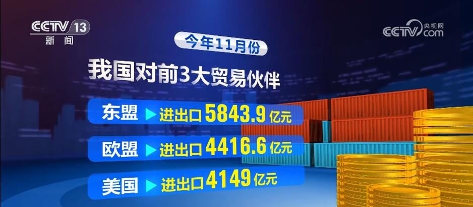 海關統(tǒng)計數據顯示,今年11月份,我國對前3大貿易伙伴東盟、歐盟、美國分別進出口5843.9億元、4416.6億元、4149億元,合計占我國進出口總值的38.9%;對共建“一帶一路”國家進出口1.72萬億元。同期,我國與拉美、非洲、中亞五國進出口延續(xù)良好態(tài)勢,分別增長9.3%、8.4%、43%。