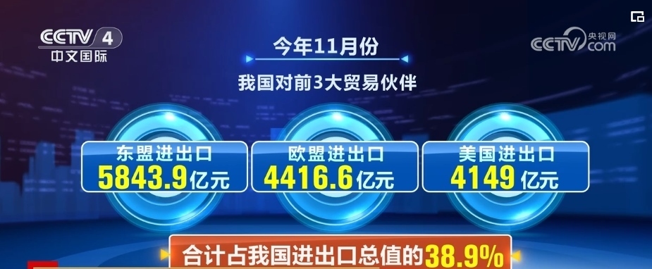 同時,對部分傳統(tǒng)市場貿易也出現(xiàn)積極變化。我國對前三大貿易伙伴東盟、歐盟、美國分別進出口5843.9億元、4416.6億元、4149億元,合計占我國進出口總值的38.9%。11月當月,中美貨物貿易同比增長2.7%,結束連續(xù)6個月的同比下降,環(huán)比增長4.3%。
