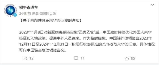 ·外交部領事保護中心:階段性減免來華簽證費。