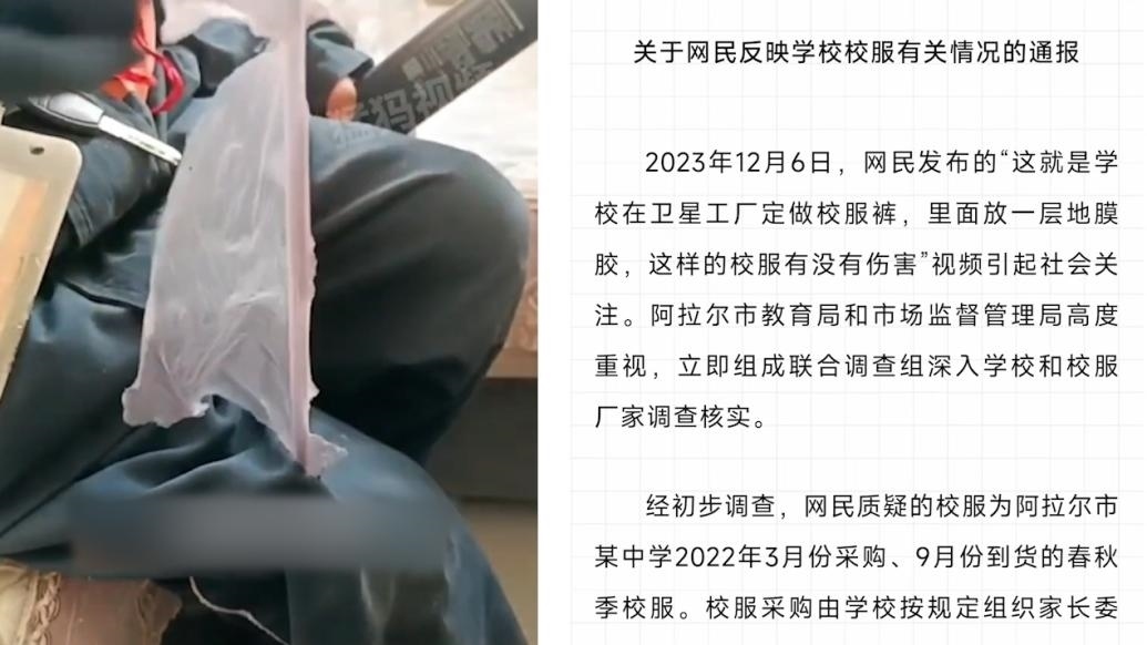 ·新疆阿拉爾官方通報校服褲夾層扯出疑似塑料膜:系脫落的校褲內部復膜,已送檢。