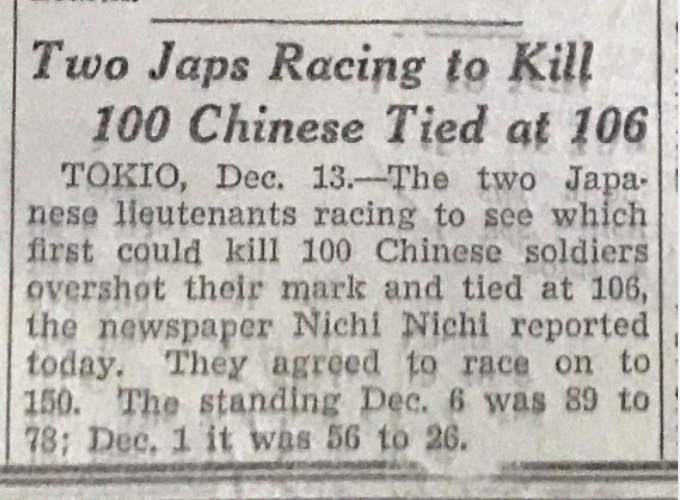 “根據(jù)《東京日日新聞》報(bào)道,兩名日本軍官比賽看誰(shuí)能先殺死100名中國(guó)士兵,結(jié)果都?xì)⒘顺^(guò)100人,雙方打平殺了106人,他們又同意重新比賽殺到150人為止,12月6日是89比78,12月1日是56比26?!边@是1937年12月14日發(fā)行的《芝加哥每日論壇》中,一篇有關(guān)兩名日本軍官進(jìn)行“百人斬”殺人競(jìng)賽的報(bào)道節(jié)選。