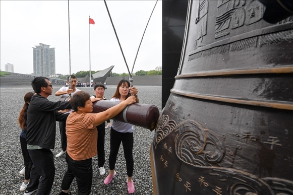 2019年9月3日,人們在侵華日軍南京大屠殺遇難同胞紀(jì)念館撞響和平大鐘。 新華社記者李博 攝