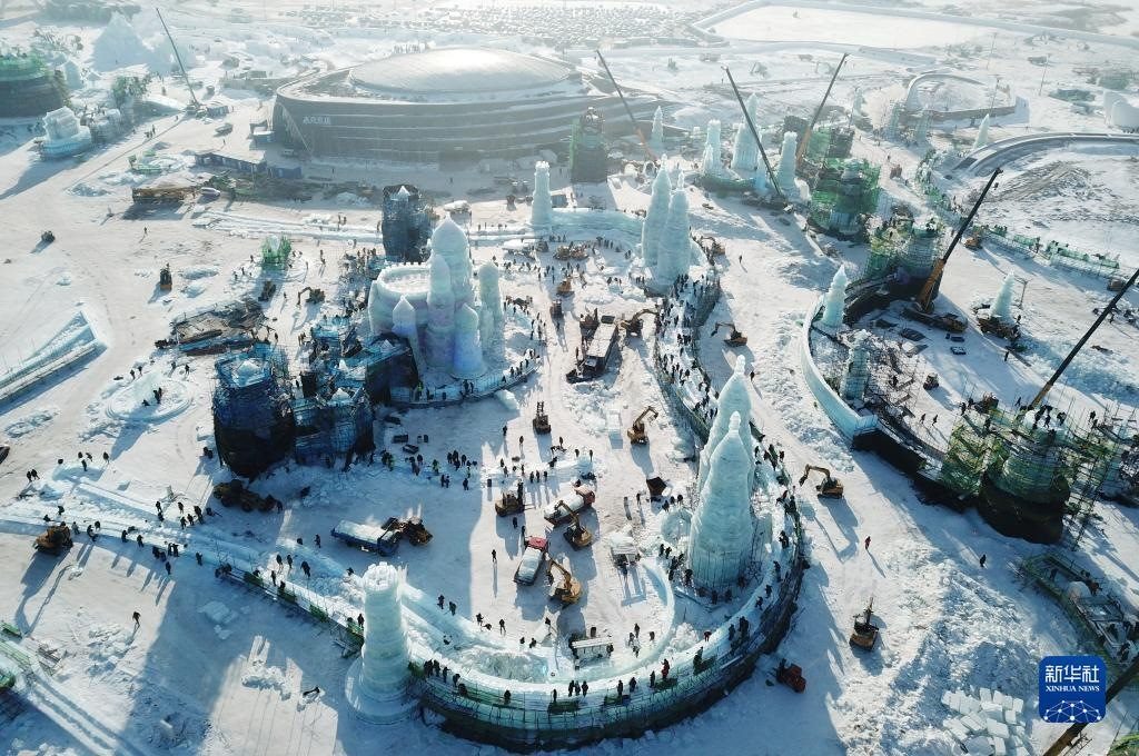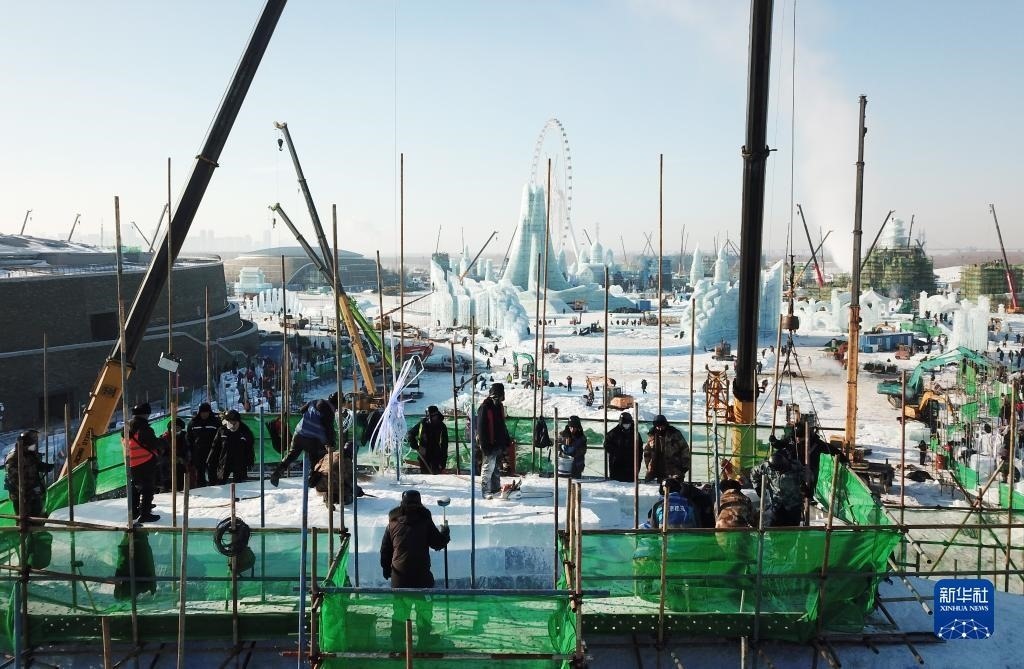 12月12日,在黑龍江省哈爾濱市冰雪大世界建設現(xiàn)場,工人在零下20多攝氏度的低溫下施工作業(yè)(無人機照片)。