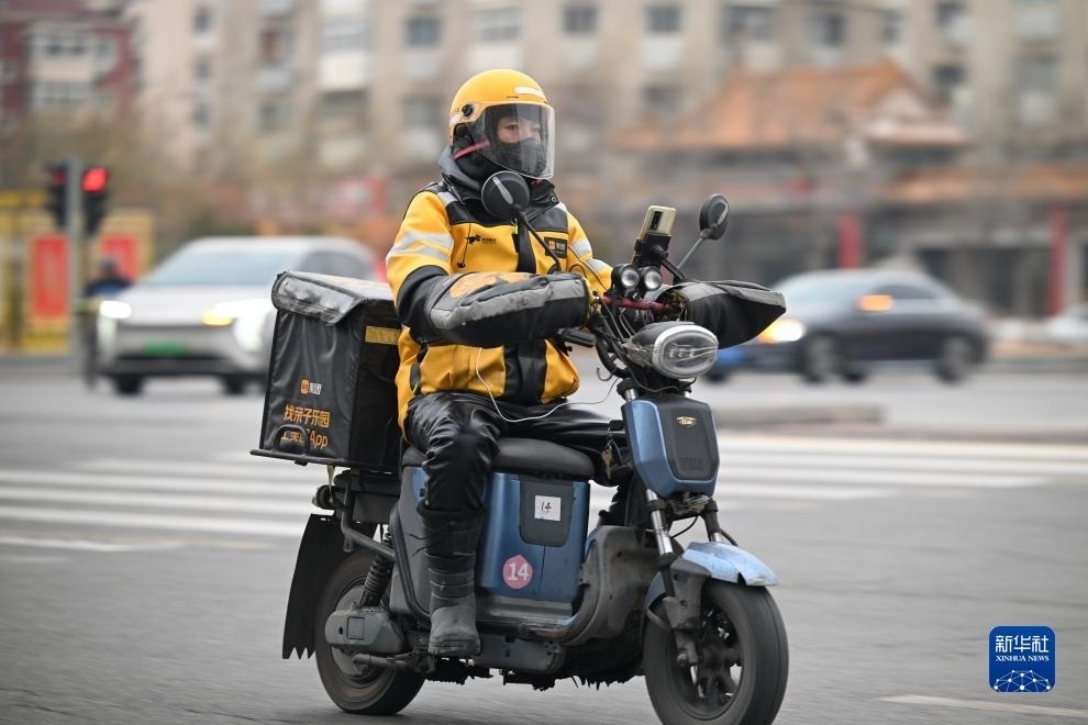 12月12日,在天津市南開區(qū),外賣騎手身著御寒裝備在送餐途中。