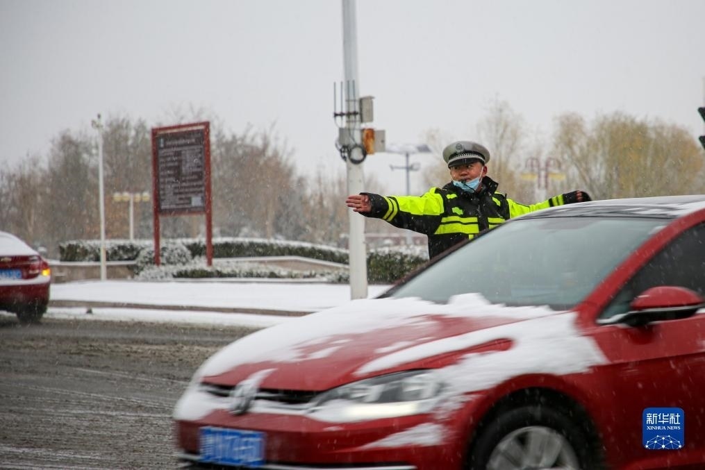 12月11日,在山東省濱州市沾化區(qū),交警在雪中引導車輛有序通行。
