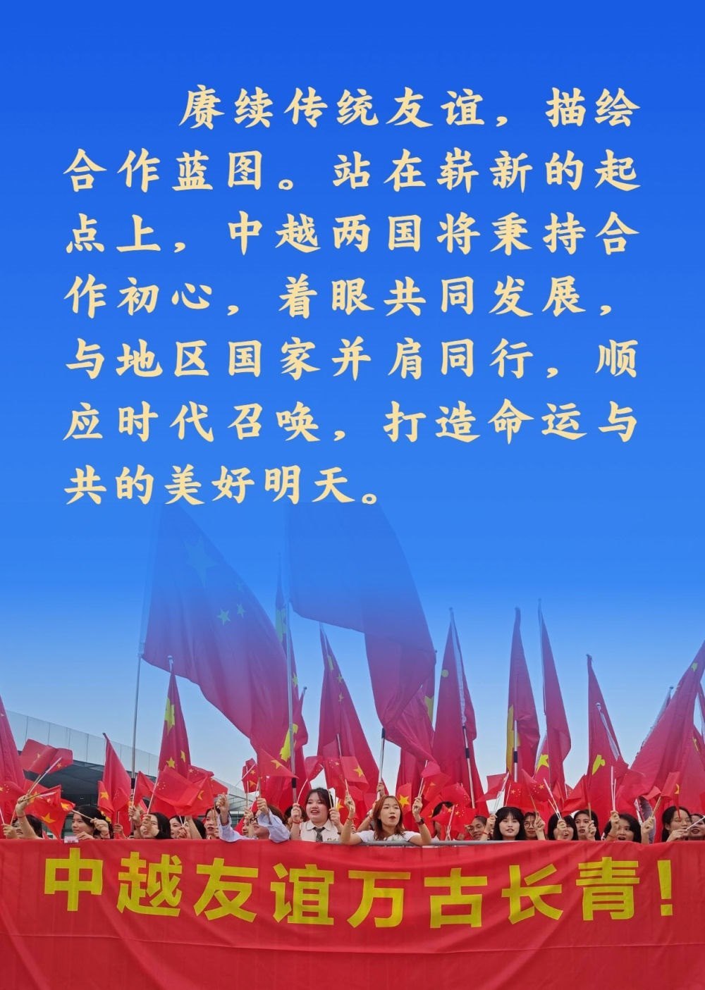 兩位總書(shū)記都認(rèn)為,中越作為友好近鄰,理想相同,理念相通。作為好鄰居、好伙伴、好兄弟、好同志,中越構(gòu)建具有戰(zhàn)略意義的命運(yùn)共同體具有天時(shí)、地利、人和的獨(dú)特優(yōu)勢(shì)。雙方應(yīng)該繼承老一輩領(lǐng)導(dǎo)人締結(jié)的傳統(tǒng)友誼,共同努力構(gòu)建命運(yùn)共同體,走好各自的現(xiàn)代化道路,實(shí)現(xiàn)互利共贏、美美與共,造福兩國(guó)人民,也為地區(qū)和平與繁榮作出積極貢獻(xiàn)。
