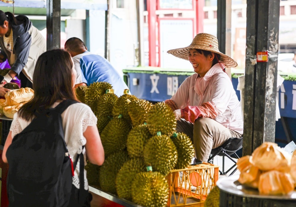 2023年5月18日,越南果商在中國(guó)廣西東興售賣榴蓮。